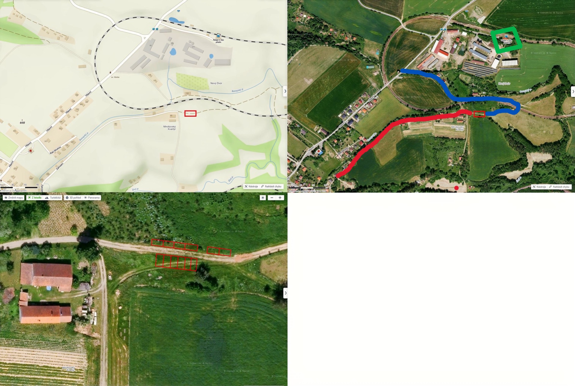 Příjezdové cesty k našemu parkovišti u Mirošovského kvartýru (červený obdélník) máme dvě: kolem statku (modrá cesta) a Zahradní ulicí (červená cesta). Dále se pokračuje pěšky dolů k jurtě (červená tečka). Prosíme rodiče, aby nezajížděli až k jurtě autem z důvodu špatné příjezdové cesty.